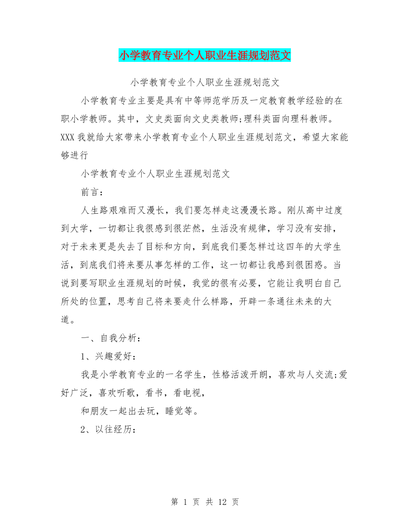 小学教育专业个人职业生涯规划范文(最新篇)