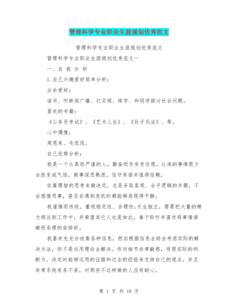 管理科学专业职业生涯规划优秀范文